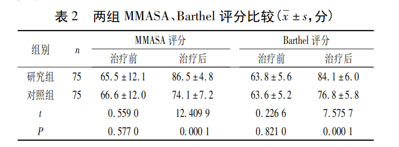 结果:治疗后,两组患者MMASA、Barthel评分均有所提高,且研究组MMASA评分、总有效率、Barthel评分均优于对照组,差异有统计学意义(P <0.05)。