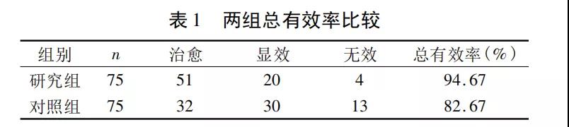 研究组总有效率明显优于对照组,差异有统计学意义(x =5. 3737,P=0.0204 <0.05) ,见表1。