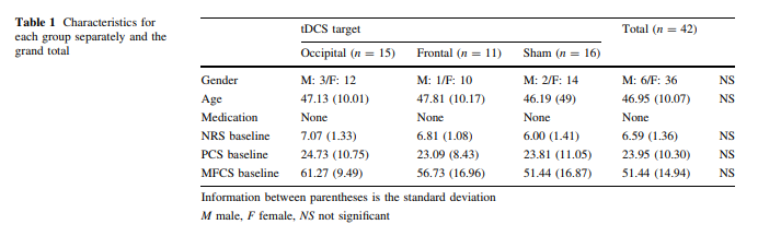 15例患者接受枕部tDCS,电极放置在左右C2神经上(即左阳极、右阴极)。11例患者接受双额刺激,阳极电极置于左侧背外侧前额叶皮层,阴极电极置于右侧背外侧前额叶皮层。刺激部位由国际10/20脑电图系统分别对应F3和F4确定。直流电最初在5秒内以坡道方式增加,直到达到1.5mA。TDCS刺激持续20分钟,然后斜度下降5秒。16例患者接受假tDCS,其中电极的放置与真正的tDCS相同(8例接受C2,8例接受额部tDCS)。假手术中的直流电首先是在一个过渡阶段被打开的,第一个5秒时电流达到1.5mA,第二个5秒时电流下降到0mA。