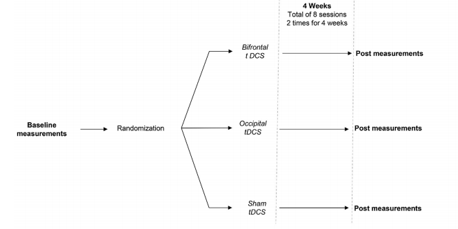 本研究为前瞻性、单盲、安慰剂对照、随机、平行组研究。患者是盲法和随机分配的三组,即假tDCS,双额tDCS或枕部tDCS。双额tDCS组和枕部tDCS组均给予8次治疗(每周2次,共4周),假手术tDCS组给予假手术4周。研究设计见图1。