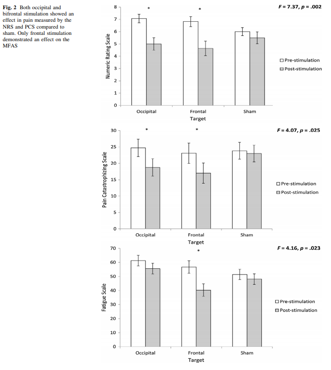 对于疲劳,可以在多发性硬化(MS)研究中找到支持其中疲劳与额叶皮质的变化功能有关。Saiote和他的同事在对MS患者进行了5次针对DLPFC的1mAtDCS治疗后,并没有发现对疲劳有显著的影响,但认为没有影响可能是由于所选择的刺激参数。本研究发现,以DLPFC为靶点的1.5mAtDCS共8个疗程可调节疲劳。对于C2靶点,枕神经刺激作为治疗纤维肌痛患者的一种主要研究方法是在C2区域植入皮下电极。与我们的研究结果不同的是,我们使用tDCS来无创靶向C2,有创方法已经被证明可以治疗纤维肌痛患者的疼痛和疲劳。非侵入性技术的试点研究调查C2tDCS(3d)作为入侵预测测量枕神经刺激进一步发现减少疼痛知觉与虚假的组相比,表明C2-tDCS可能成为另一种非侵入性的疼痛治疗纤维肌痛。