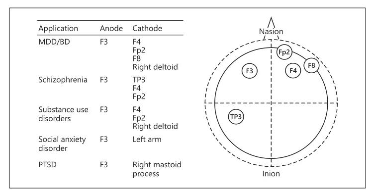 国外学者研究了经颅直流电刺激在几个常见的精神疾病中的应用,并总结出了最常用的电极片位置,下面我们简单的了解一下。