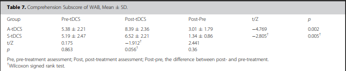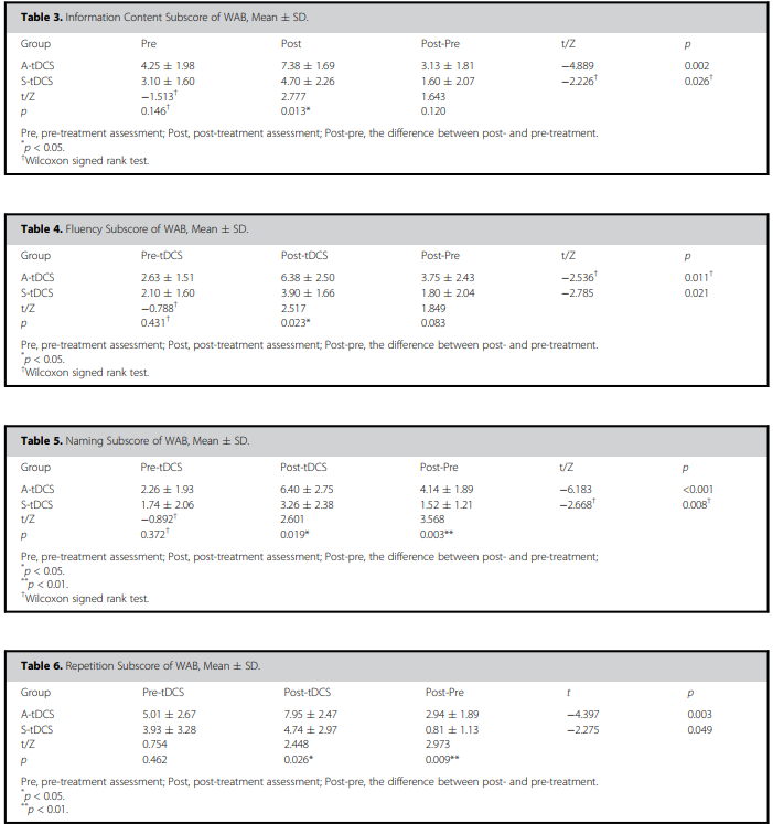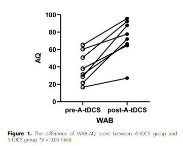 综上所述,我们发现在布洛卡区2mA的A-tDCS联合SLT治疗非流畅性PSA是有效的。这表明tDCS结合SLT进行PSA的常规康复训练具有很大的潜力。
