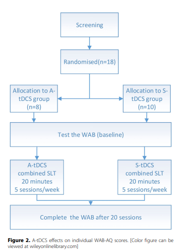 材料与方法:PSA患者随机分为阳极tDCS (A-tDCS)组(n = 8)和假tDCS (S-tDCS)组(n = 10)。阳极和阴极固定在左额下回(L-IFG)和右肩三角肌上。A-tDCS由2 mA组成,持续20 min, S-tDCS电流从2 mA开始,30秒后自动下降到0 mA,刺激同时进行30 min的SLT。刺激+ SLT疗程持续四周,每周五次。治疗前给予WAB测验(Western aphasianbattery, WAB),获得基线评分,治疗结束后再给予一次,计算失语商(AQ)。