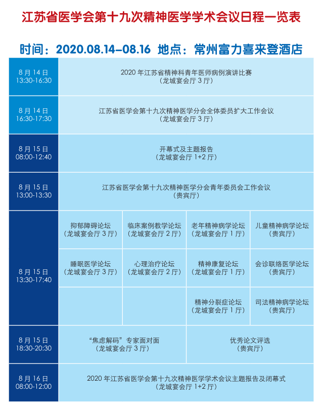 江苏省第十九次精神医学学术会议于2020年8月14日-16日在江苏常州常州富力喜来登酒店召开。本次会议由江苏省医学会、江苏省医学会精神医学分会主办,常州市医学会、联勤保障部队第九O四医院医院协办。大会邀请了国内外著名专家举行专题讲座、教学查房、优秀论文交流等。本次会议内容涵盖抑郁障碍、睡眠障碍、心理治疗与危机干预、儿童精神病学、精神分裂症、司法精神病学、临床案例PBL教学、精神康复、精神护理、老年精神病等专业领域,并且与时俱进,特设了新冠疫情下心理卫生干预专题。