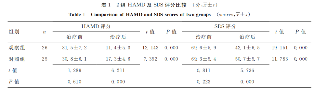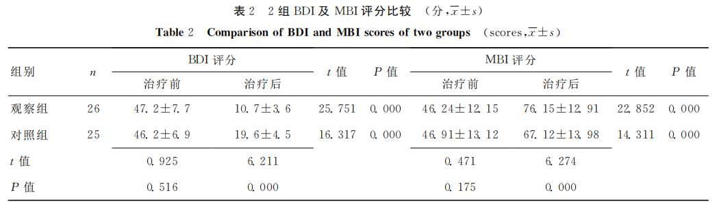 治疗前2组患者HAMD、SDS、BDI、MBI评分比较差异均无统计学意义(P>0.05)。治疗4周后2组HAMD、SDS、BDI及MBI评分均较治疗前改善,观察组较对照组明显改善(P<0.05)。见表1、表2。