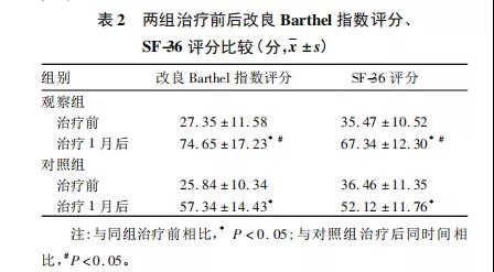 两组治疗后 Barthel 指数评分及SF-36评分均较治疗前升高,观察组治疗后1个月 Barthel 指 数评分及SF-36评分高于对照组( P均<0.05 ),见表2。