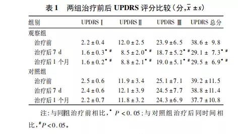 观察组治疗后7d、1个月 UPDRS 评分均降低,与治疗前相比,P均<0.05;对照组治疗前后UPDRS 评分差异无统计学意义;观察组治疗后7 d、1 个月UPDRS评分均降低,与对照组相比,P均<0.05。